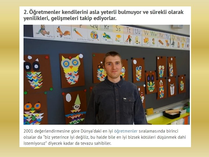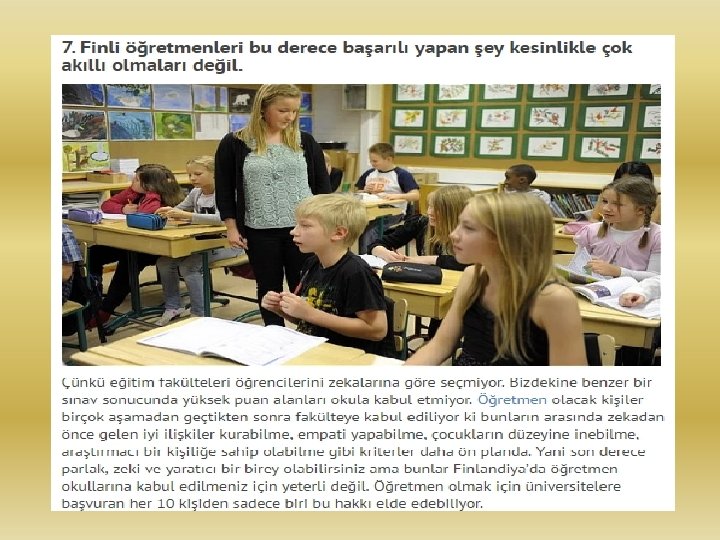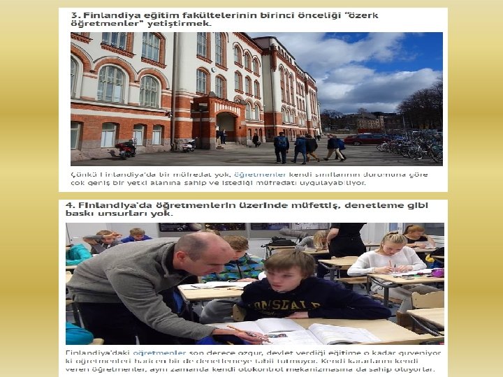 4 - Bizim sınıflarımızda eğer bütün öğrenciler yerlerinde oturuyor ve ses çıkmıyorsa, o sınıfın öğretmeni övgü alıyor. Ama Finlandiya’da durum tam tersi… Eğer bir sınıftan hiç ses çıkmıyorsa, öğrenciler sıralarında oturuyor ve hiç kalkmıyorlarsa o öğretmen soruşturmaya alınıyor. Çünkü Fin eğitim sisteminde ders anlatan bir öğretmen yok. Hep birlikte etkinlik yapan sınıflar var. Bu yüzden Fin okullarındaki sınıflarda, “Ayakta gezinme evladım, otur yerine, ” sözü pek duyulmuyor.