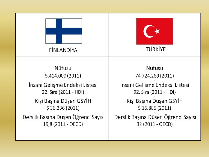 TÜRKİYE EĞİTİM SİSTEMİYLE KARŞILAŞTIRILMASI Finlandiya Türkiye Okula başlama yaşı 7 5, 5 Günlük ortalama ders sayısı 6 6 -8 Derslik başına düşen öğrenci sayısı 15 -25 35 -40 Zorunlu eğitim (yıl) 9 (7 -16 yaş) 12 (5, 5 -18 yaş) Okula gitme şekli Yürüyerek/bisikletle Okul servisi Özel okul Yok Var