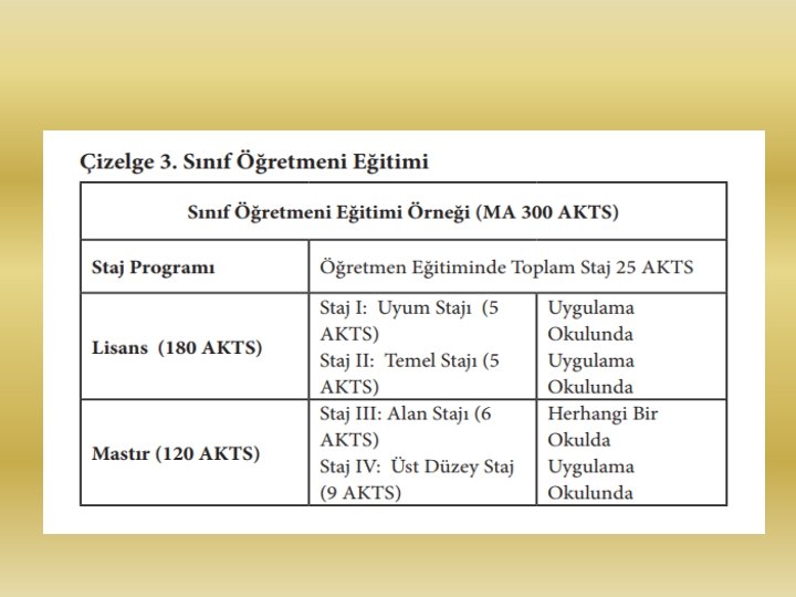 ÖĞRETMEN YETİŞTİRME Öğretmen adaylarına programın ilk üç yılında dörder hafta, son yıl ise beş hafta olmak üzere uygulama okullarında hem öğretmen hem de üniversite hocasının rehberliğinde staj yapma imkanı sağlanır. Öğretmen olmak için bu lisans programını bitirmek yeterli değildir. Sınıf öğretmeni adayları (1 ile 6. sınıflar) eğitim bilimlerinden, branş öğretmenleri (7 ile 12. sınıflar) kendi alanlarıyla ilgili yüksek lisans derecesine sahip olmak zorundadırlar.