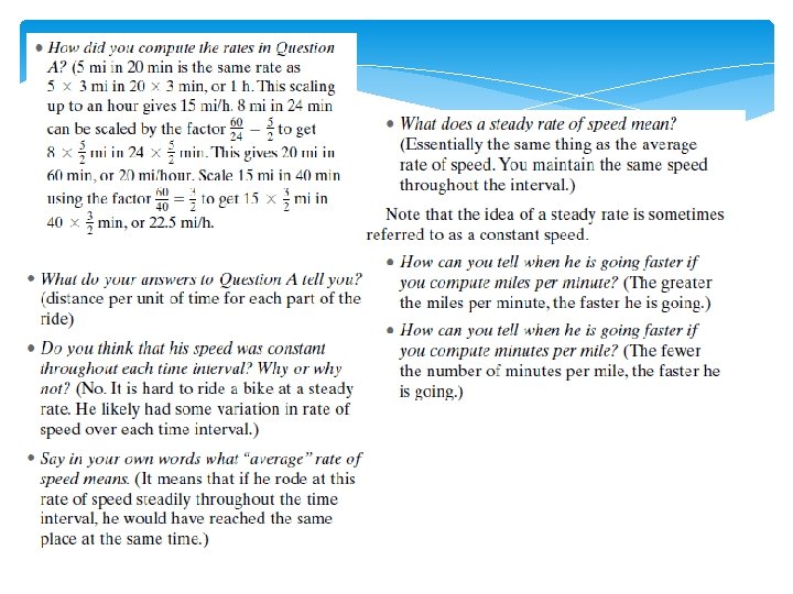 Class Discussion & Sharing • How did you compute the rates in Question A? • What do you answers to Question A tell you? • Do you think that his speed was constant throughout each time interval? Why or why not? • Say in your own words what “average” rate of speed means. • What does a steady rate of speed mean? • Did you know? That the idea of a steady rate is sometimes referred to as a constant speed. • How can you tell when he is going faster if you compute miles per minute?