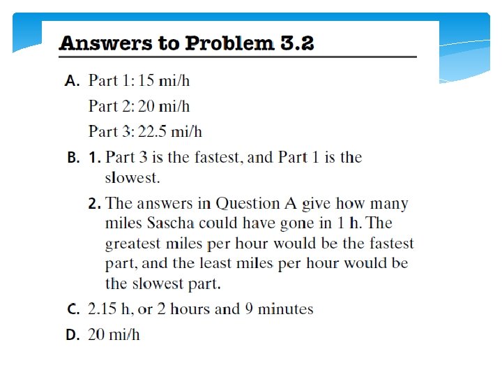 Explore 3. 2 Have you thought about? What exactly do you know about Sascha’s trip? Tell me in your own words what Question C or D is asking you to figure out. If I send two of you out of the room to go to the library to get a book, is it possible for you to each walk at different rates and get there at the same time? If so, give an example. Could one of you walk at a steady rate over the entire distance and get there at the same time as someone walking for part of the time at a faster rate? If so, how? This situation is an interesting one since both the time and the distance have to be considered in answering Questions C and D. Each has to cover 28 miles in 84 minutes.