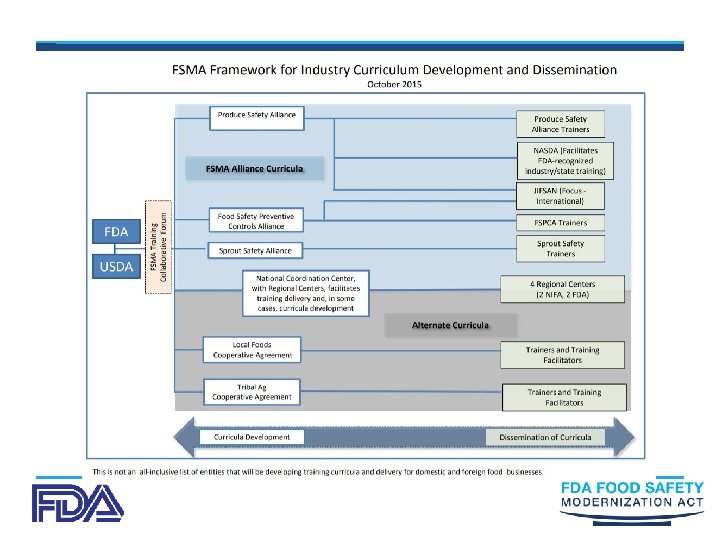 Education, Outreach, and Technical Assistance • Collaboration with industry, academia and researchers to provide training and educational materials to industry and regulatory officials • Formation of Training Alliances – Produce Safety Alliance – Food Safety Preventive Controls Alliance – Sprout Safety Alliance