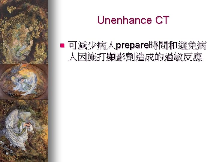 Use of C. M. (oral&rectal)而不做 enhanced CT 優:即有些病人只喝C. M. ,初步 的unenhanced CT即有lesion時, 則可不須再做enhanced CT。 n 缺:病人作第一次unenhanced CT沒有發現finding時,則須加做 一次enhanced CT,會增加病人 exposure dose和可能會delay診 斷。 n