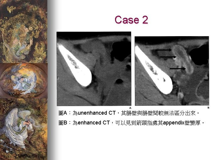 case 2: acute suppurative appendicitis(rupture) CT:unenhanced A-colon很脹,且appendix 旁有骯髒的液體存在。