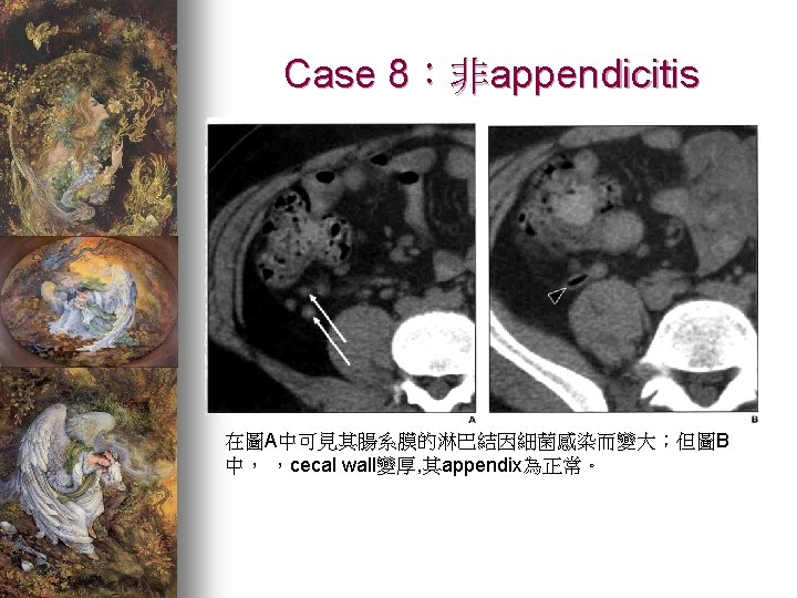 Case 9:非appendicitis 41歲男性,有cecal diverticulitis,其cecal wall厚, 有憩室產生,而其appendix為正常(arrowhead)。
