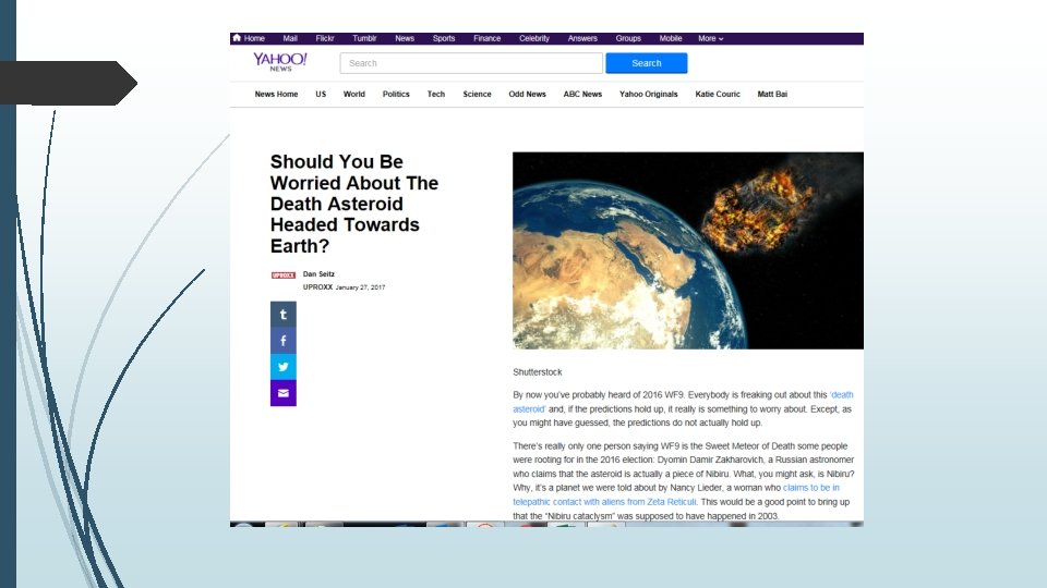 Consider the Source Is there an author’s name attached to this piece? Go to the website’s “About” section: Does the site describe itself as a “fantasy news” or “satirical news” site? Does the “Contact Us” section include an email address that matches the domain (not a Gmail or Yahoo email address)?