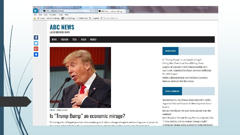Consider the Source Fake news can slip into your life in many ways. Be wary of sponsored content, suggested posts, and third party advertising…even on trusted sites Does a quick search for the name of the website raise any suspicions? Be careful of sites with names similar to those you trust, for example ABCnews. com. co is a fake news site which mimics the URL, design and logo of the actual news site ABCnews. com