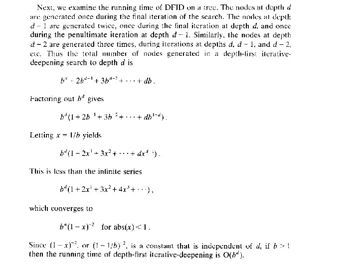 Iterative Deepening Search Complete, optimal, O(bd) space What about run time? Breadth first search: 1 + b 2 + … + bd-1 + bd E. g. b=10, d=5: 1+10+100+1, 000+100, 000 = 111, 111 Iterative deepening search: (d+1)*1 + (d)*b + (d-1)*b 2 + … + 2 bd-1 + 1 bd E. g. 6+50+400+3000+20, 000+100, 000 = 123, 456 In fact, run time is asymptotically optimal: O(bd). We prove this next…