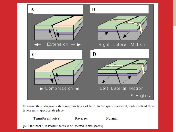 Faulting • Faults are caused by plate movement • The movement may be vertical, horizontal or both • It causes the rocks within the earths crust to experience stress • A fracture occurs along a line of weakness in the rock