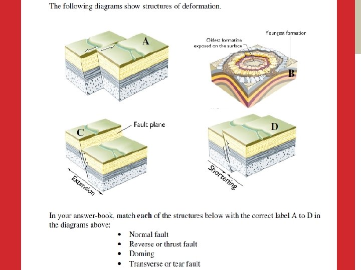 PAIR-WORK REVISION QUESTIONS 1. Where is folding most likely to occur? 2. What is Orogeny? 3. Give an example of mountains formed during the Caledonian period. 4. Explain the two ways domes can form. 5. Name a dome structure found in Ireland. 6. What causes faulting? 7. List the three types of fault. 8. Explain how a rift valley occurs.