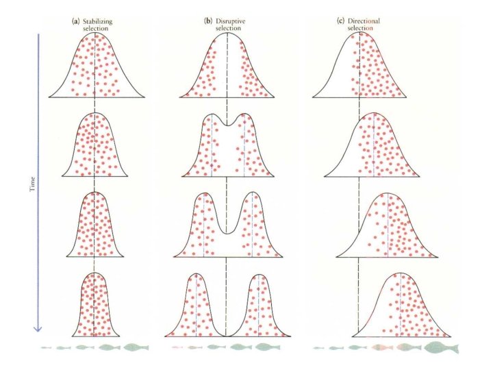 Main Types of Selection Pressures • Directional Selection – Natural selection favors one extreme of the population for that trait – often happens when environment changes in a consistent way- e. g. climate gets colder. • Disruptive Selection – Natural selection favors both extremes selected – Causes species to diverge • Stabilizing Selection – Natural selection favors the average for population selected