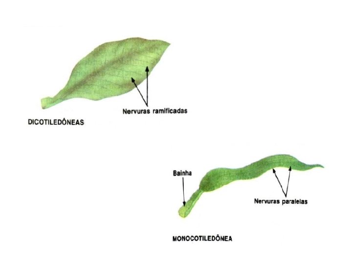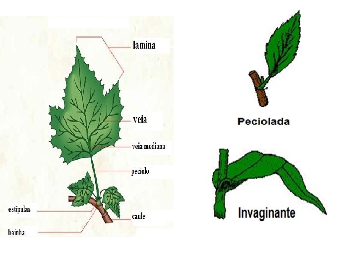 FOLHA - ANATOMIA ESTRUTURA DA FOLHA COMPLETA: • Limbo, Pecíolo, Bainha e Estípulas São constituídas basicamente de: • Limbo - laminar e verde, comumente muito delgado; • Pecíolo - espécie de pedicelo, inserido na base do limbo; • Bainha - situada na parte inferior do pecíolo. • Estípulas – apêndices que se formam ao lado da folha em número de dois.