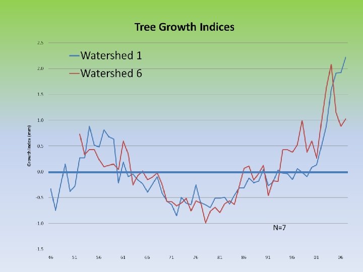 Procedure used to establish a radial growth index: • The mean annual increment width was calculated for the entire core. • This value was then subtracted from each increment measurement. • An index value greater than 0 indicates above average growth. Negative numbers represent below average growth.