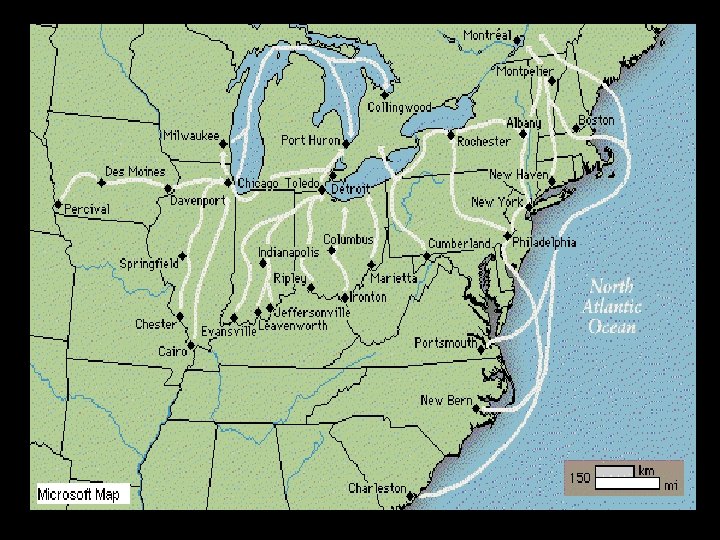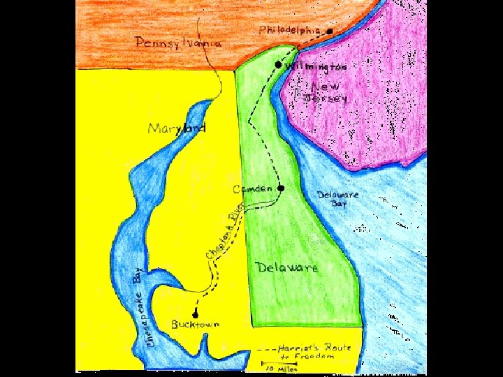 The route you traveled— based on Harriet Tubman’s actual journeys— appears on the map (next drawing). Using modern roads, the trip would be 560 miles.
