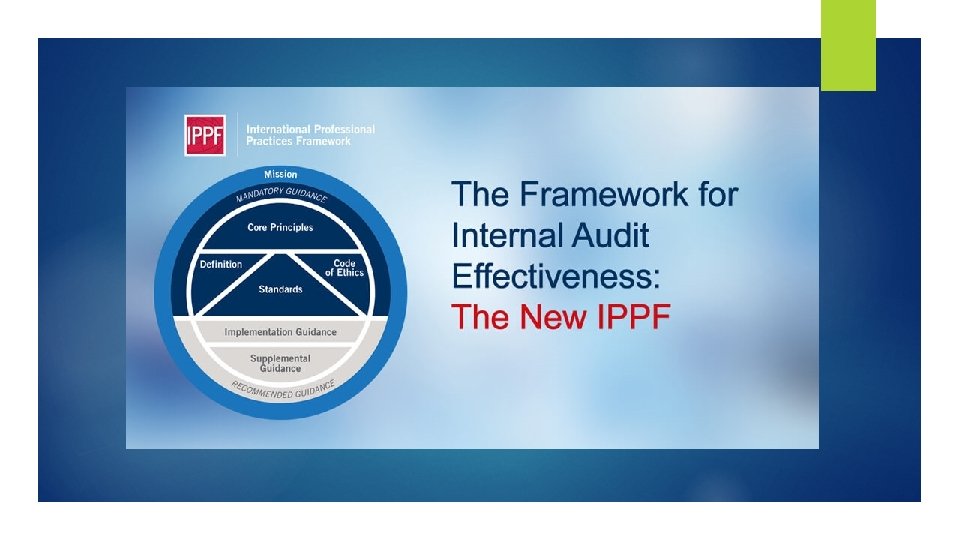 Summary of the main IPPF changes The Mission of Internal Audit and the Core Principles for the Professional Practice of Internal Auditing are new elements of the IPPF. Implementation Guidance replaced all the existing Practice Advisories. Members continued to use Practice Advisories to support conformance with the Standards until such time as new Implementation Guides were issued. Various New Implementation Guides issued. Supplemental Guidance: All Practice Guides, Global Technology Audit Guides (GTAGs), and Guides to the Assessment of IT Risks (GAIT) automatically become part of the recommended Supplemental Guidance layer.