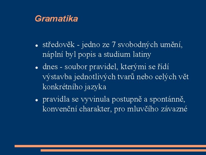 Gramatika středověk - jedno ze 7 svobodných umění, náplní byl popis a studium latiny dnes - soubor pravidel, kterými se řídí výstavba jednotlivých tvarů nebo celých vět konkrétního jazyka pravidla se vyvinula postupně a spontánně, konvenční charakter, pro mluvčího závazné