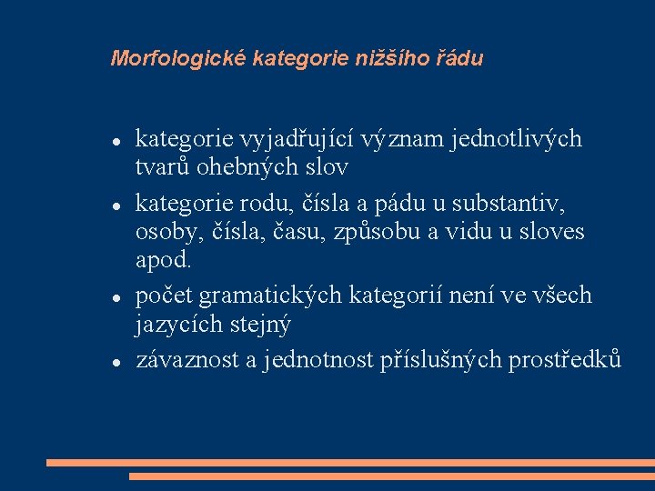 Morfologické kategorie nižšího řádu kategorie vyjadřující význam jednotlivých tvarů ohebných slov kategorie rodu, čísla a pádu u substantiv, osoby, čísla, času, způsobu a vidu u sloves apod. počet gramatických kategorií není ve všech jazycích stejný závaznost a jednotnost příslušných prostředků
