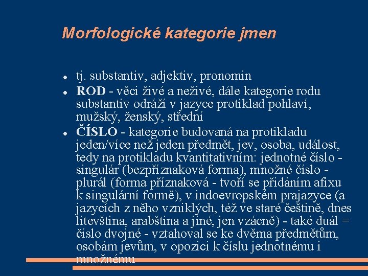 Morfologické kategorie jmen tj. substantiv, adjektiv, pronomin ROD - věci živé a neživé, dále kategorie rodu substantiv odráží v jazyce protiklad pohlaví, mužský, ženský, střední ČÍSLO - kategorie budovaná na protikladu jeden/více než jeden předmět, jev, osoba, událost, tedy na protikladu kvantitativním: jednotné číslo - singulár (bezpříznaková forma), množné číslo - plurál (forma příznaková - tvoří se přidáním afixu k singulární formě), v indoevropském prajazyce (a jazycích z něho vzniklých, též ve staré češtině, dnes litevština, arabština a jiné, jen vzácně) - také duál = číslo dvojné - vztahoval se ke dvěma předmětům, osobám jevům, v opozici k číslu jednotnému i množnému
