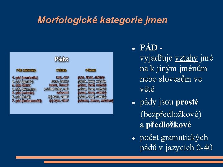 Morfologické kategorie jmen PÁD vyjadřuje vztahy jmé na k jiným jménům nebo slovesům ve větě pády jsou prosté (bezpředložkové) a předložkové počet gramatických pádů v jazycích 0 -40