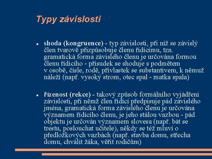 Typy závislosti shoda (kongruence) - typ závislosti, při níž se závislý člen tvarově přizpůsobuje členu řídícímu, tzn. gramatická forma závislého členu je určována formou členu řídícího - přísudek se shoduje s podmětem v osobě, čísle, rodě, přívlastek se substantivem, k němuž náleží (např. vysoký strom, otec spal - matka spala) řízenost (rekce) - takový způsob formálního vyjádření závislosti, při němž člen řídící předpisuje pád závislého jména, gramatická forma závislého členu je určována významem řídícího členu, je jeho stálou vazbou - pád objektu je určován významem slovesa (např. bát se trestu, poslouchat učitele), někdy se též mluví o předložkových vazbách (např. stavba domu, střecha domu, chválit žáka, věřit rodičům)