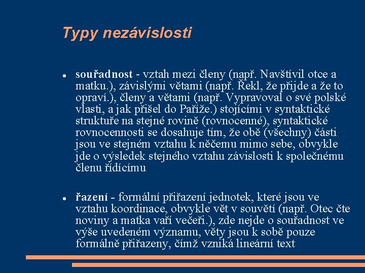 Typy nezávislosti souřadnost - vztah mezi členy (např. Navštívil otce a matku. ), závislými větami (např. Řekl, že přijde a že to opraví. ), členy a větami (např. Vypravoval o své polské vlasti, a jak přišel do Paříže. ) stojícími v syntaktické struktuře na stejné rovině (rovnocenné), syntaktické rovnocennosti se dosahuje tím, že obě (všechny) části jsou ve stejném vztahu k něčemu mimo sebe, obvykle jde o výsledek stejného vztahu závislosti k společnému členu řídícímu řazení - formální přiřazení jednotek, které jsou ve vztahu koordinace, obvykle vět v souvětí (např. Otec čte noviny a matka vaří večeři. ), zde nejde o souřadnost ve výše uvedeném významu, věty jsou k sobě pouze formálně přiřazeny, čímž vzniká lineární text
