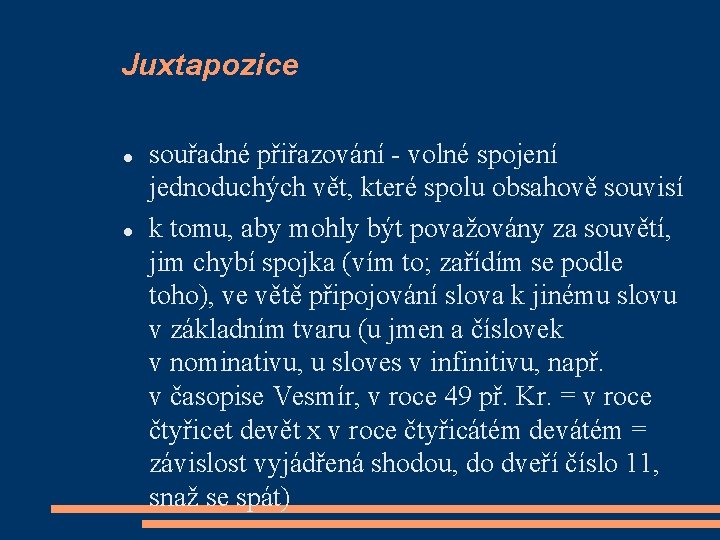 Juxtapozice souřadné přiřazování - volné spojení jednoduchých vět, které spolu obsahově souvisí k tomu, aby mohly být považovány za souvětí, jim chybí spojka (vím to; zařídím se podle toho), ve větě připojování slova k jinému slovu v základním tvaru (u jmen a číslovek v nominativu, u sloves v infinitivu, např. v časopise Vesmír, v roce 49 př. Kr. = v roce čtyřicet devět x v roce čtyřicátém devátém = závislost vyjádřená shodou, do dveří číslo 11, snaž se spát)