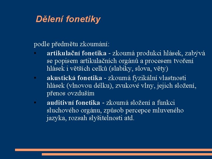 Dělení fonetiky podle předmětu zkoumání: • artikulační fonetika - zkoumá produkci hlásek, zabývá se popisem artikulačních orgánů a procesem tvoření hlásek i větších celků (slabiky, slova, věty) • akustická fonetika - zkoumá fyzikální vlastnosti hlásek (vlnovou délku), zvukové vlny, jejich složení, přenos ovzduším • auditivní fonetika - zkoumá složení a funkci sluchového orgánu, způsob percepce mluveného jazyka, rozsah slyšitelnosti atd.