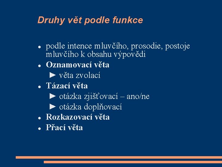 Druhy vět podle funkce podle intence mluvčího, prosodie, postoje mluvčího k obsahu výpovědi Oznamovací věta ► věta zvolací Tázací věta ► otázka zjišťovací – ano/ne ► otázka doplňovací Rozkazovací věta Přací věta