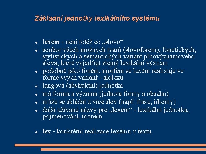 Základní jednotky lexikálního systému lexém - není totéž co „slovo“ soubor všech možných tvarů (slovoforem), fonetických, stylistických a sémantických variant plnovýznamového slova, které vyjadřují stejný lexikální význam podobně jako foném, morfém se lexém realizuje ve formě svých variant - alolexů langová (abstraktní) jednotka má formu a význam (jednota formy a obsahu) může se skládat z více slov (např. fráze, idiomy) další užívané názvy pro „lexém“ - lexikální jednotka, pojmenování, moném lex - konkrétní realizace lexému v textu