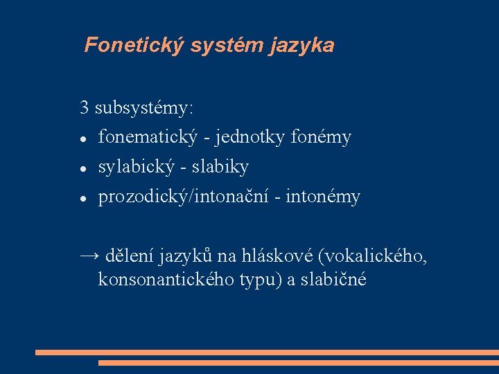 Fonetický systém jazyka 3 subsystémy: fonematický - jednotky fonémy sylabický - slabiky prozodický/intonační - intonémy → dělení jazyků na hláskové (vokalického, konsonantického typu) a slabičné