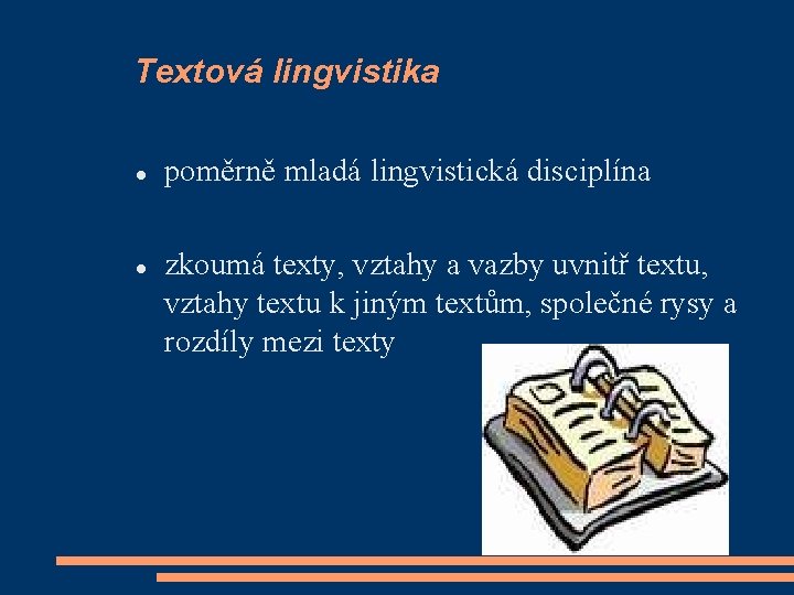 Textová lingvistika poměrně mladá lingvistická disciplína zkoumá texty, vztahy a vazby uvnitř textu, vztahy textu k jiným textům, společné rysy a rozdíly mezi texty