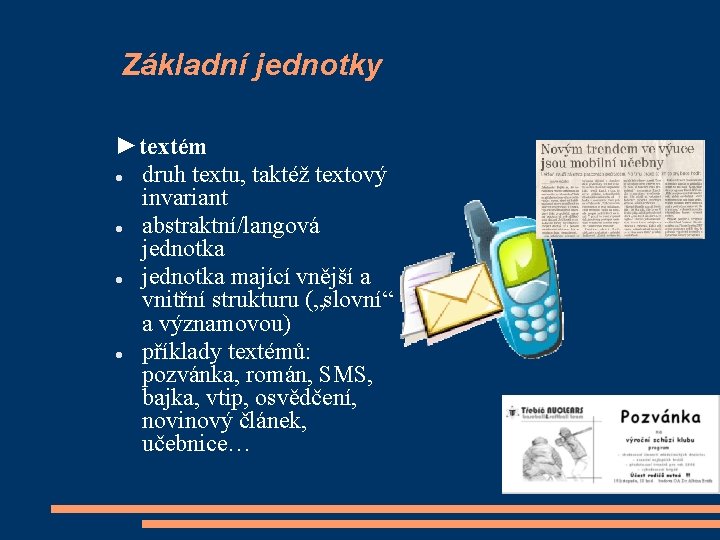 Základní jednotky ►textém druh textu, taktéž textový invariant abstraktní/langová jednotka mající vnější a vnitřní strukturu („slovní“ a významovou) příklady textémů: pozvánka, román, SMS, bajka, vtip, osvědčení, novinový článek, učebnice…