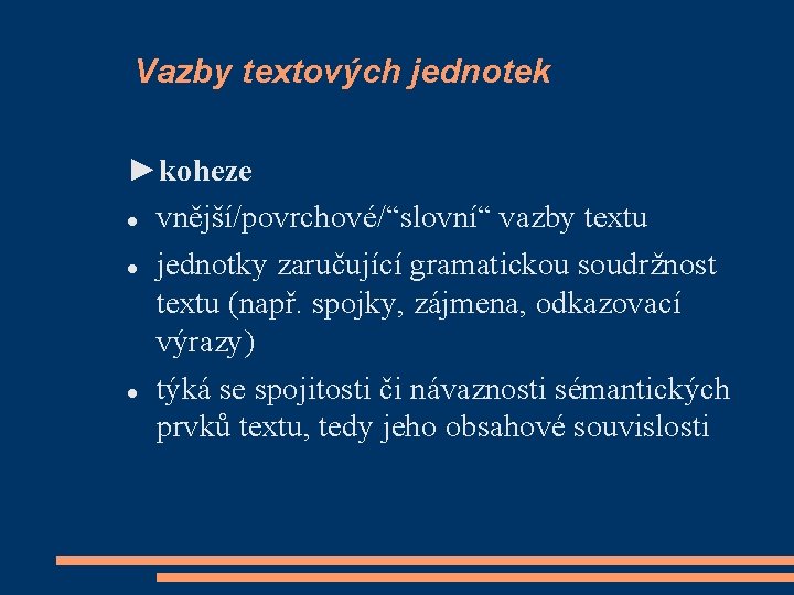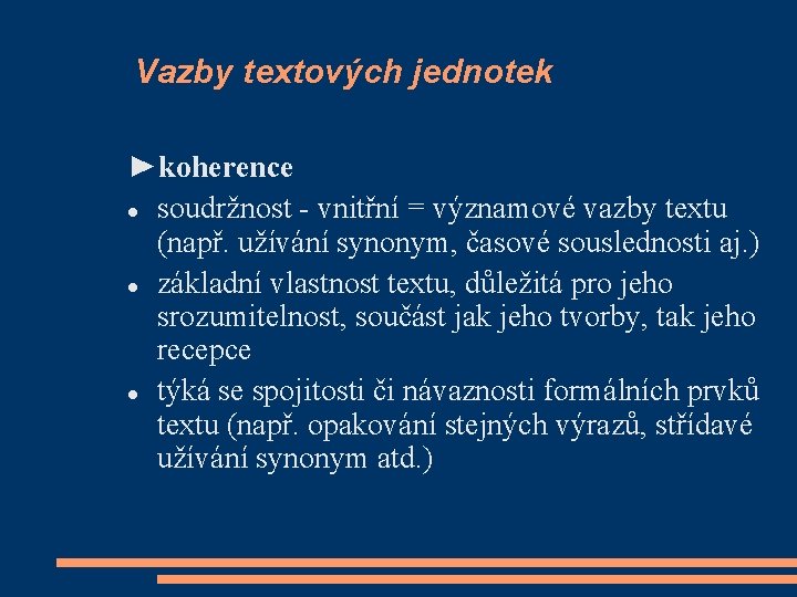 Vazby textových jednotek ►koherence soudržnost - vnitřní = významové vazby textu (např. užívání synonym, časové souslednosti aj. ) základní vlastnost textu, důležitá pro jeho srozumitelnost, součást jak jeho tvorby, tak jeho recepce týká se spojitosti či návaznosti formálních prvků textu (např. opakování stejných výrazů, střídavé užívání synonym atd. )