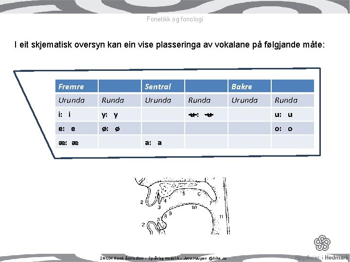 Fonetikk og fonologi Med litt fantasi er det ikkje vanskeleg å førestille seg at denne firkanten kan representere munnhola, der den øvre delen av firkanten er ganen, og den nedre linja er tunga. Den venstre sida er den fremre delen av munnhola, mens den høgre sida er den bakre delen. Det er litt vanskelegare å kjenne etter kvar den enkelte vokalen blir artikulert. Det er litt lettare med konsonantane, sidan tunga har ei meir aktiv og tydeleg rolle i artikulasjonen av konsonantar. Vokalteikna blir plasserte i vokalfirkanten der ein kan seie det er minst avstand mellom tunga og ganen under uttalen av dei enkelte lydane. fremre sentral bakre trong/høg midtre open/låg 2 NO 34 Norsk årsstudium – Språkleg modul A – Jens. Haugan @ hihm. no