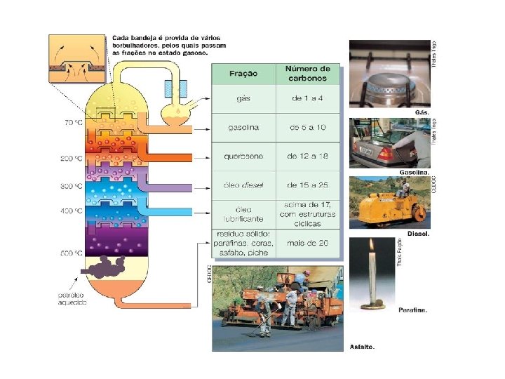 • Nas refinarias, o petróleo bruto é refinado em dois tipos básicos de derivados: os óleos combustíveis, como querosene, o óleo diesel, a gasolina, etc. , que são usados na indústria e nos veículos automotores; e as matérias primas, como a nafta, utilizadas pelas indústrias petroquímicas;