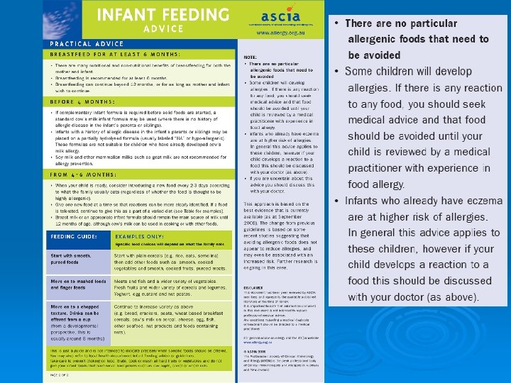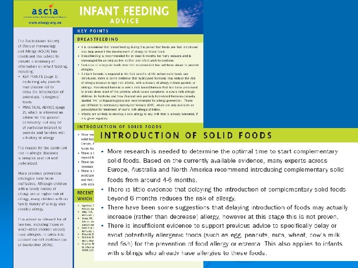 COT statement Dec 2008 Ø “The shift in the balance of evidence since 1998 is such that the Committee believes that the previous precautionary advice to avoid peanut consumption during pregnancy, breast feeding and infancy, where there is atopy or atopic disease in family members, is no longer appropriate. ” Ø Expert opinion in Europe, US and Australasia is similar