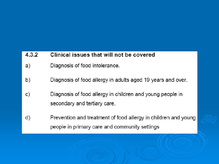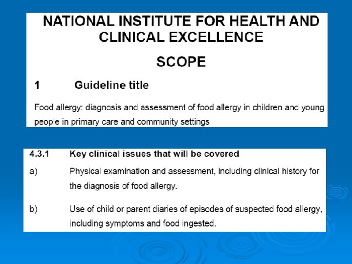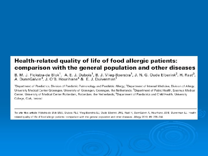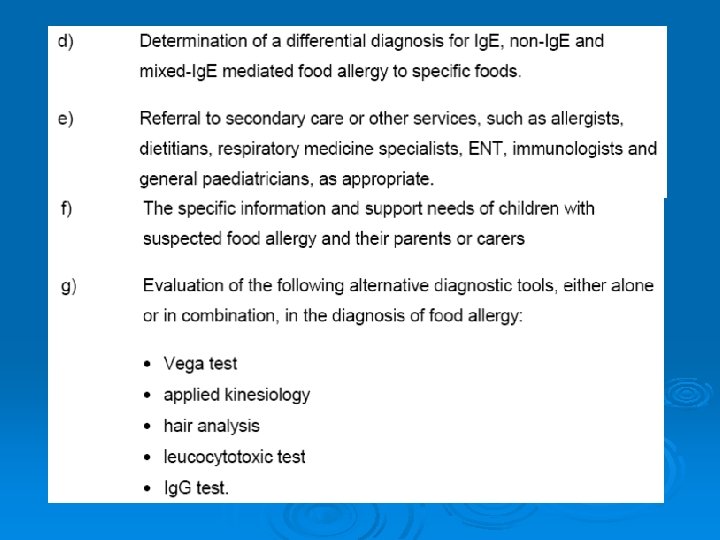 Ø Ø Ø There is no evidence to recommend maternal avoidance of allergens in pregnancy or breast feeding (unless allergy in mother or child) Early introduction of foods (not before 4 months) may help induce oral tolerance Oral desensitisation may become a useful treatment. More research needed. Quality of life affected in food allergy Several bodies are developing diagnosis and management guidelines which will be helpful. Still a complex area!