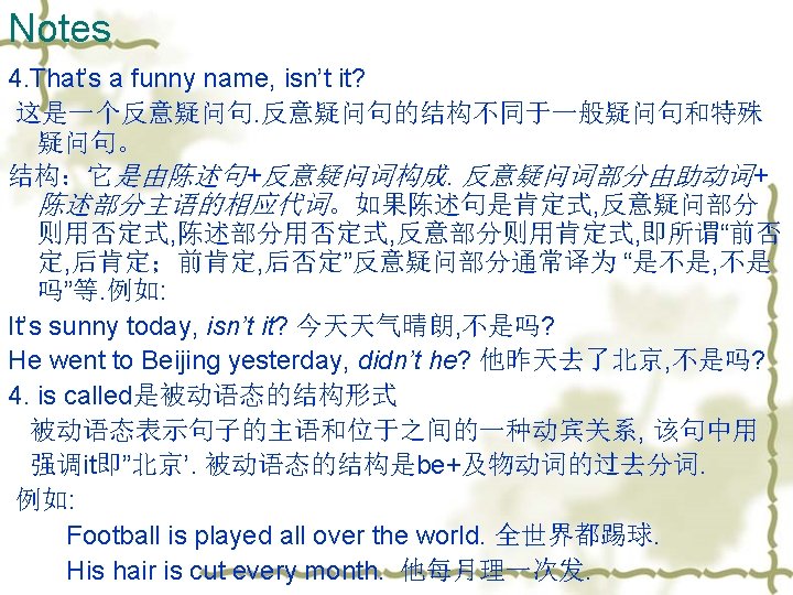 Notes 3. When we studied China, our teacher took us to a Chinese restaurant and a Chinese grocery store. 当我们研究中国的时候, 我们老师带我们 去了一个中国饭店和一个中国杂货店. Took 是take的过去式. “take…to…” 把某人带到某地 Please take the box to the next room. 请把这个箱 子搬到隔壁的屋子. His father always takes him to the park on Sunday. 每逢星期天, 他的父亲总是带他去公园.
