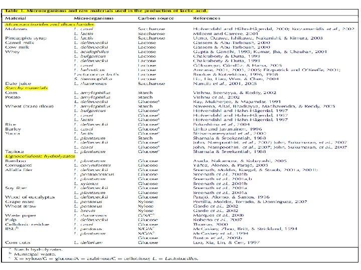 • Most lactic acid bacteria are catalase negative, immobile, do not form spores and have optimum growth temperature between 20 and 45 °C. • In addition, they have high tolerance to acidic conditions (p. H < 5), which confers them a competitive advantage over other bacteria. • As shown in Table 1, the selection of a suitable microorganism enables one to ferment sugar solutions of different origin.