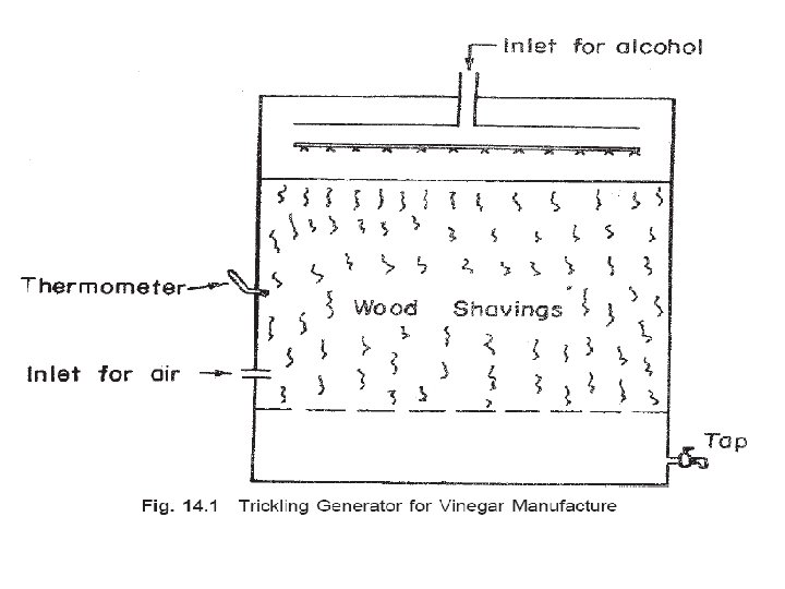 • The modern vinegar generator consists of a tank constructed usually of wood preferably of cypress and occasionally of stainless steel. • A false bottom supports the coils of birchwood shavings and separates them from the collection chamber which occupies about one fifth of the total capacity of the generator (Fig. 14. 1). • A pump circulates the alcohol-acetic acid mixture from the reservoir through a heat exchanger to the top of the generator where a spray mechanism distributes it over the packing. • Air is forced through the false bottom up through the set-up.