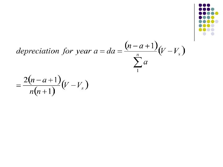 l l The amount accumulated in the fund after a years of useful life must be equal to the total amount of depreciation up to that time. This is the same as the difference between the original value of the property V at the start of the service life and the book ( asset ) value at the end of a years. Therefore, total amount of depreciation after a years = V-Va