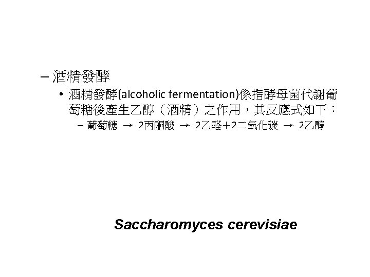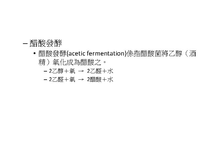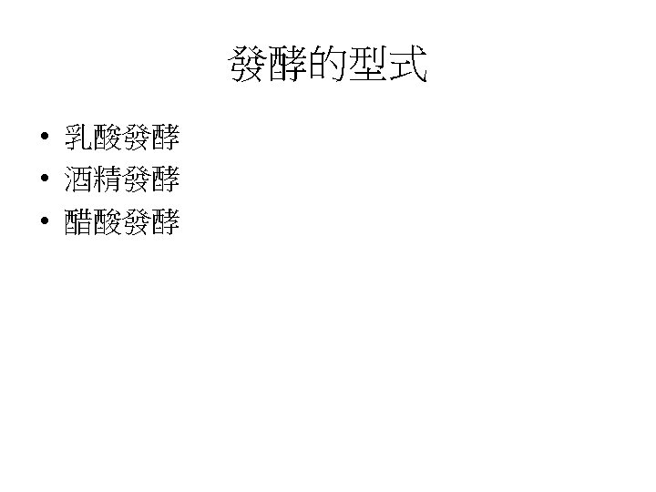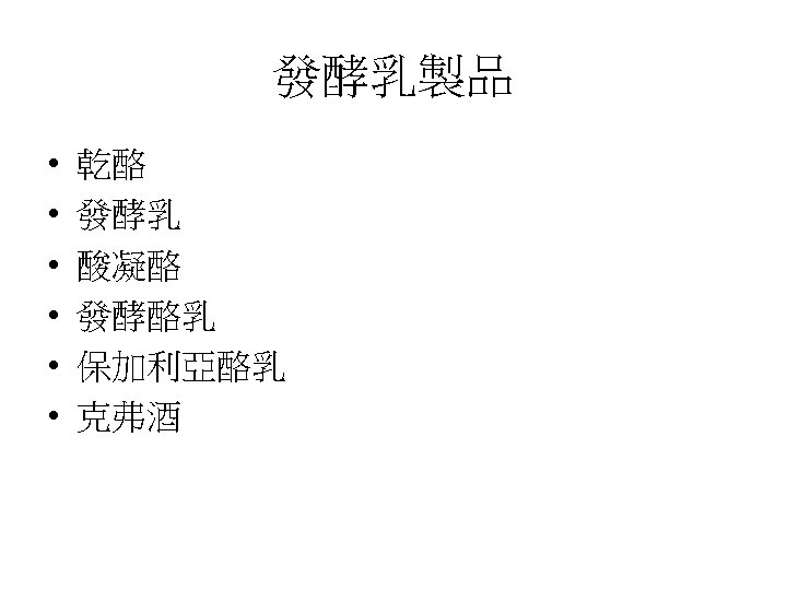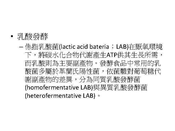 Food fermentation • One of the oldest methods to preserve food • The most common ferment foods – Dairy products – 優酪乳、養樂多 • 優生菌 probiotic bacteria – 乳酸菌 Lactic acid bacteria (LAB) • Lactobacillus, Lactococcus, Streptococcus – 雙叉桿菌 • Bifiodobacterium