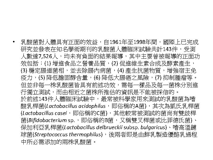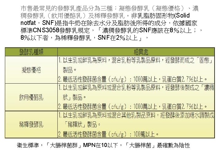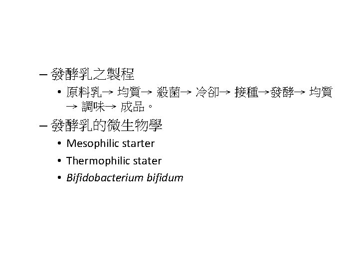 – 味全優酪乳 ABLS • A菌-Lactobacillus acidophilus B菌-Bifidobacterium Iongum L菌-Lactobacillus bulgaricus S菌-Streptococcus thermophilus – 養樂多 Yakult代田菌(Lactobacillus casei Shirota) – 比菲多 Bifidobacterium bifidum – Each group must record the bacterial culture and ingredient in the product