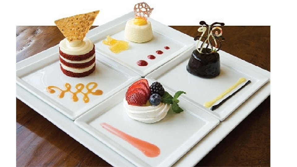 BALANCE THE DISH Colours, shapes, and textures should be balanced to ensure diners are not overwhelmed. Also, the presentation should never overpower flavour