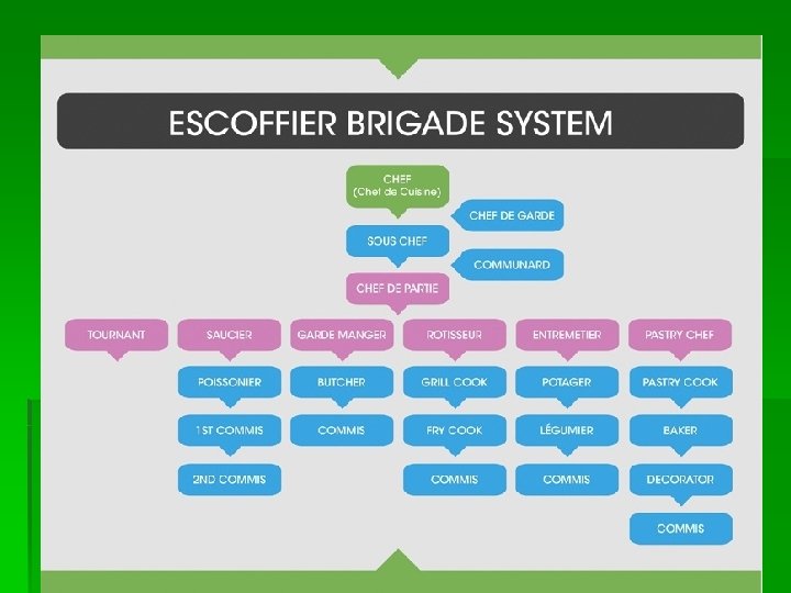 BRIGADE SYSTEM § AUGUSTE ESCOFFIER CREDITED WITH THIS ORGANIZATIONAL SYSTEM OF KITCHEN ROLES BY FOOD PREPARATION OR SPECIALTY. MODERNIZED COURSES A LA CARTE ORDERED SERVICE MISE EN PLACE COOKING AS AN ART