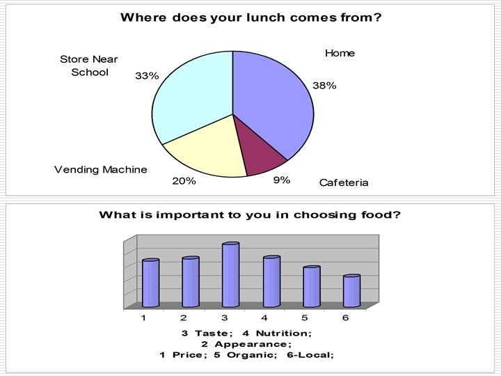 Results of Past AGSC 250 Findings • The majority of students brought food from home (~ 38%) • Substantial number also bought lunch at a store near the school (~ 33%) • The most important characteristics were taste, nutrition, and appearance • They showed little interest about learning where their food comes from and how healthy it is