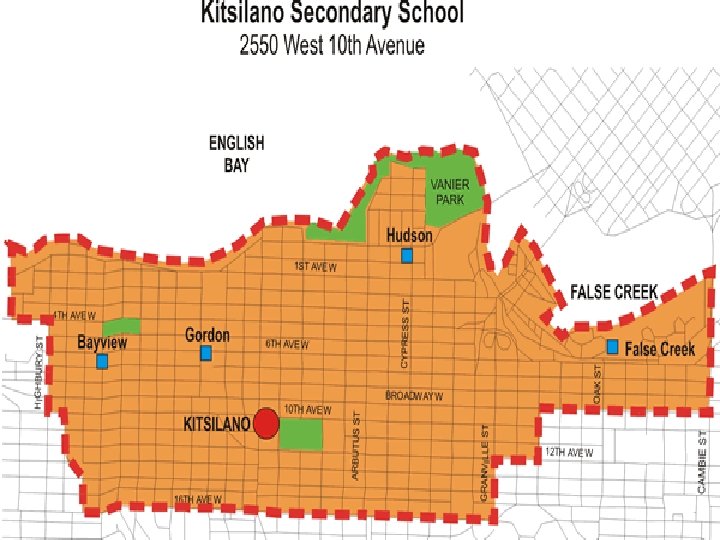 Kitsilano High School n n n Located at 2550 West 10 th Avenue Consists of the Kitsilano, Fairview and West Point Grey communities 5 elementary feeder schools Wide variety of programs Approximately 1, 630 students
