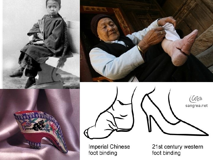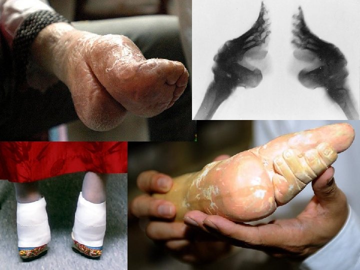 Opposition n The Manchus who conquered China in the 17 th century tried without success to abolish the practice. – Manchu women were forbidden from binding their feet or the feet of their daughters. Instead they wore 'flower bowl' shoes which gave the illusion of tiny feet. n Bound feet became an important differentiating marker between Manchu and Han. n In 1911, the Republic of China government banned foot binding; women were told to unwrap their feet lest they be killed. – Some women's feet grew 1/2 - 1 inch after the unwrapping, though some found the new growth process extremely painful and emotionally and culturally devastating.