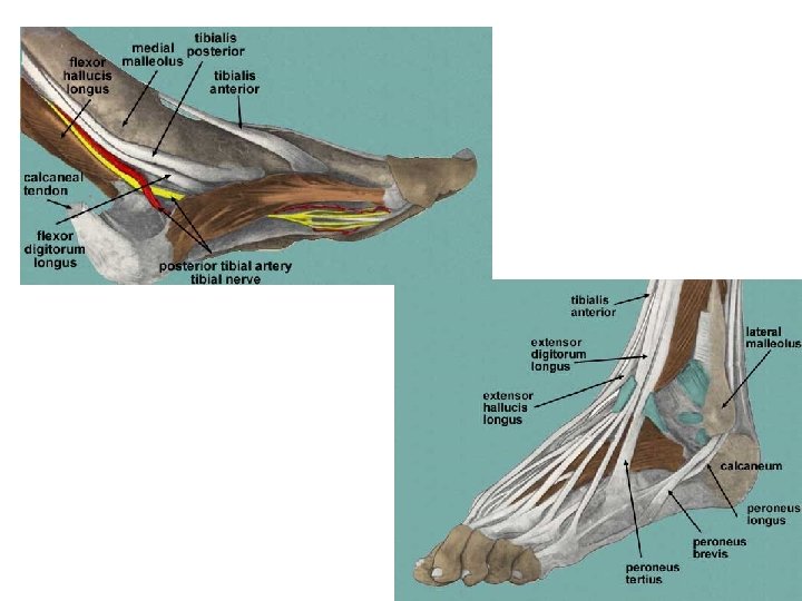 • In order for these flexor and extensor tendons to perform their duty properly, they must be kept close to the bones of the ankle. The structures that keep them close are the retinaculae: • superior extensor retinaculum • flexor retinaculum • inferior extensor retinaculum
