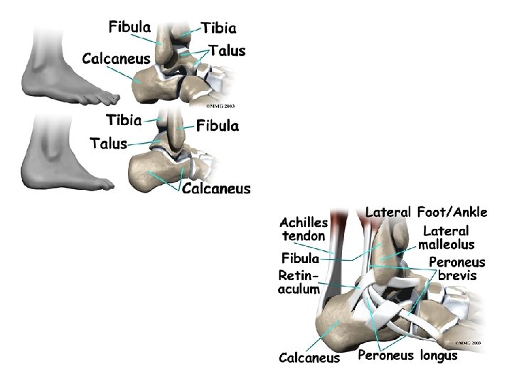 Ankle • Talus is the only bone that articulates with the fibula and tibia to form the ankle joint [talocrural joint] • tibia medial malleolus • Fibula lateral malleolus • During walking the talus distributes about half the weight to the calcaneus the rest to the other tarsal bones